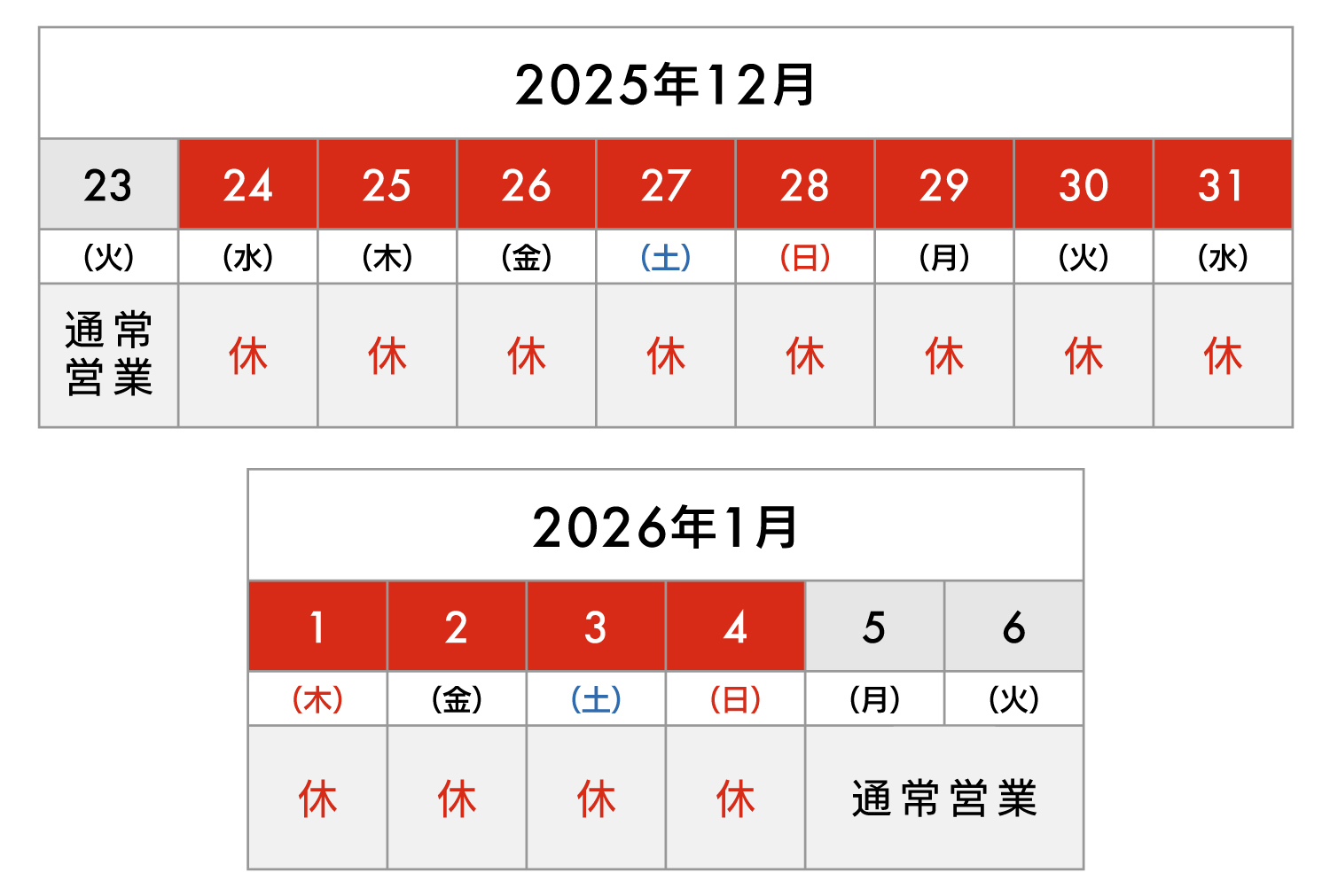 休業期間:2025年12月24日(水)〜2026年1月4日(日)