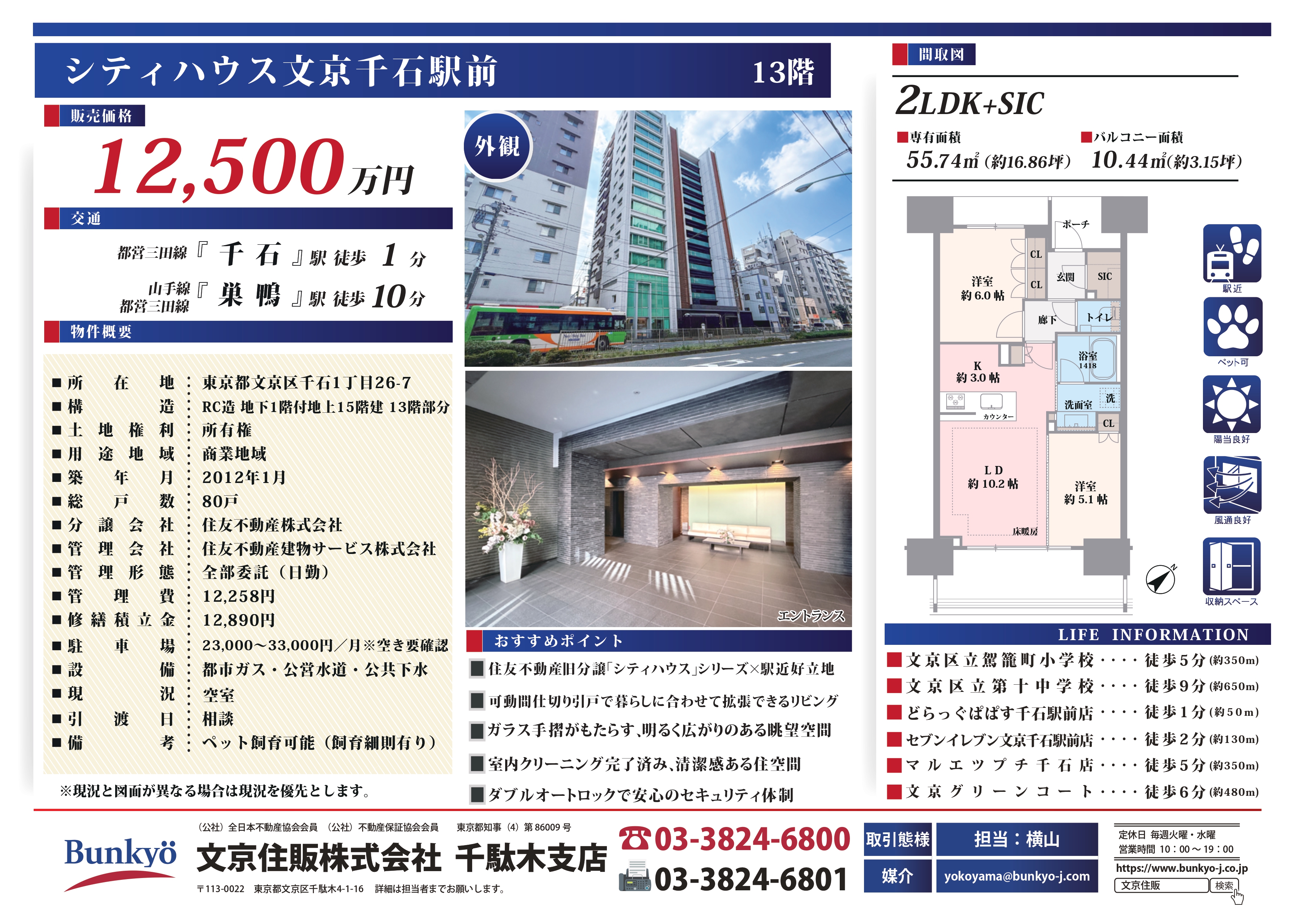 住友不動産旧分譲の「シティハウス文京千石駅前」13階・東南向き・眺望良好な住戸のご紹介です。