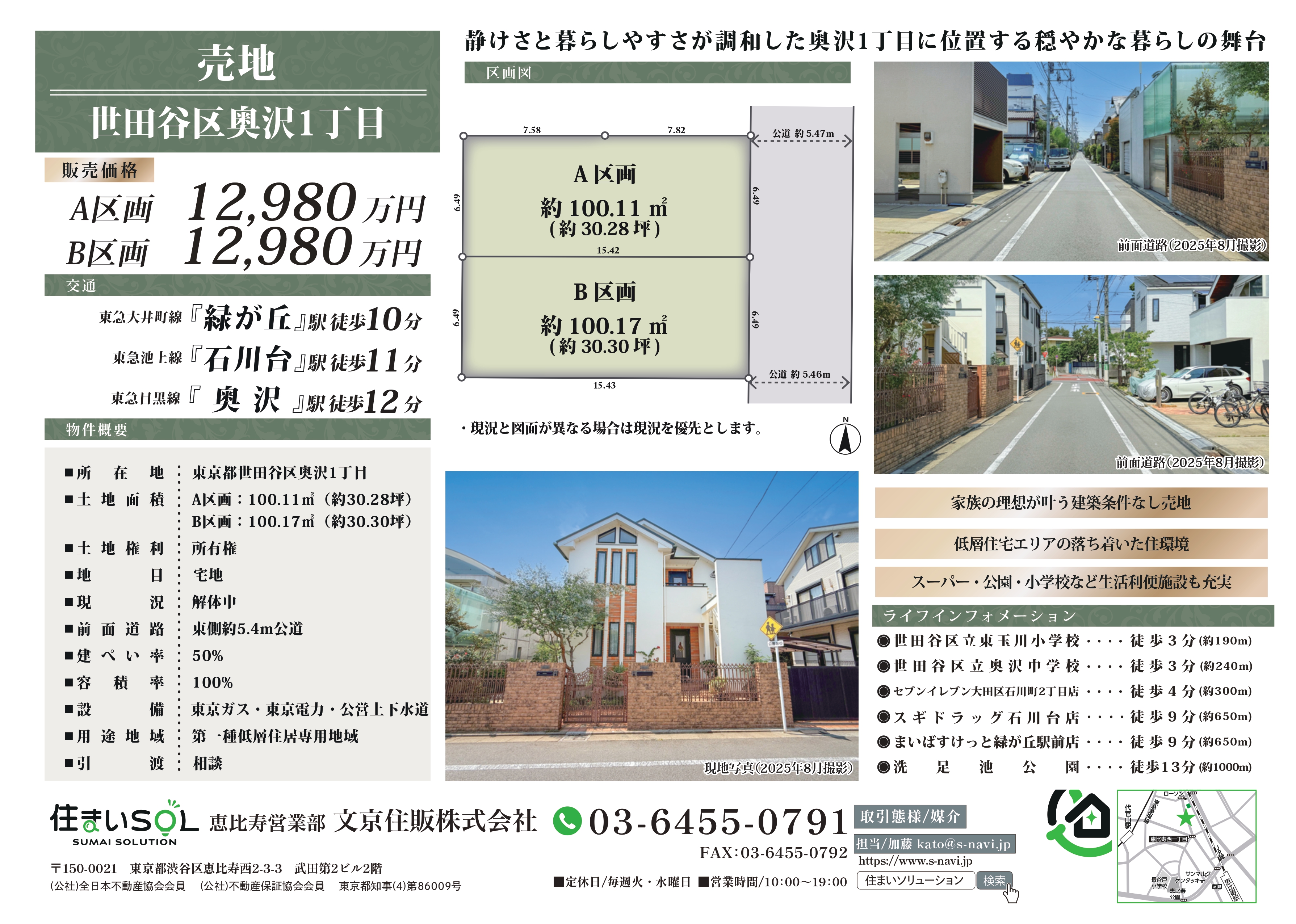 目黒線「奥沢」駅 徒歩8分、大井町線「緑が丘」駅 徒歩8分の3駅利用可能。