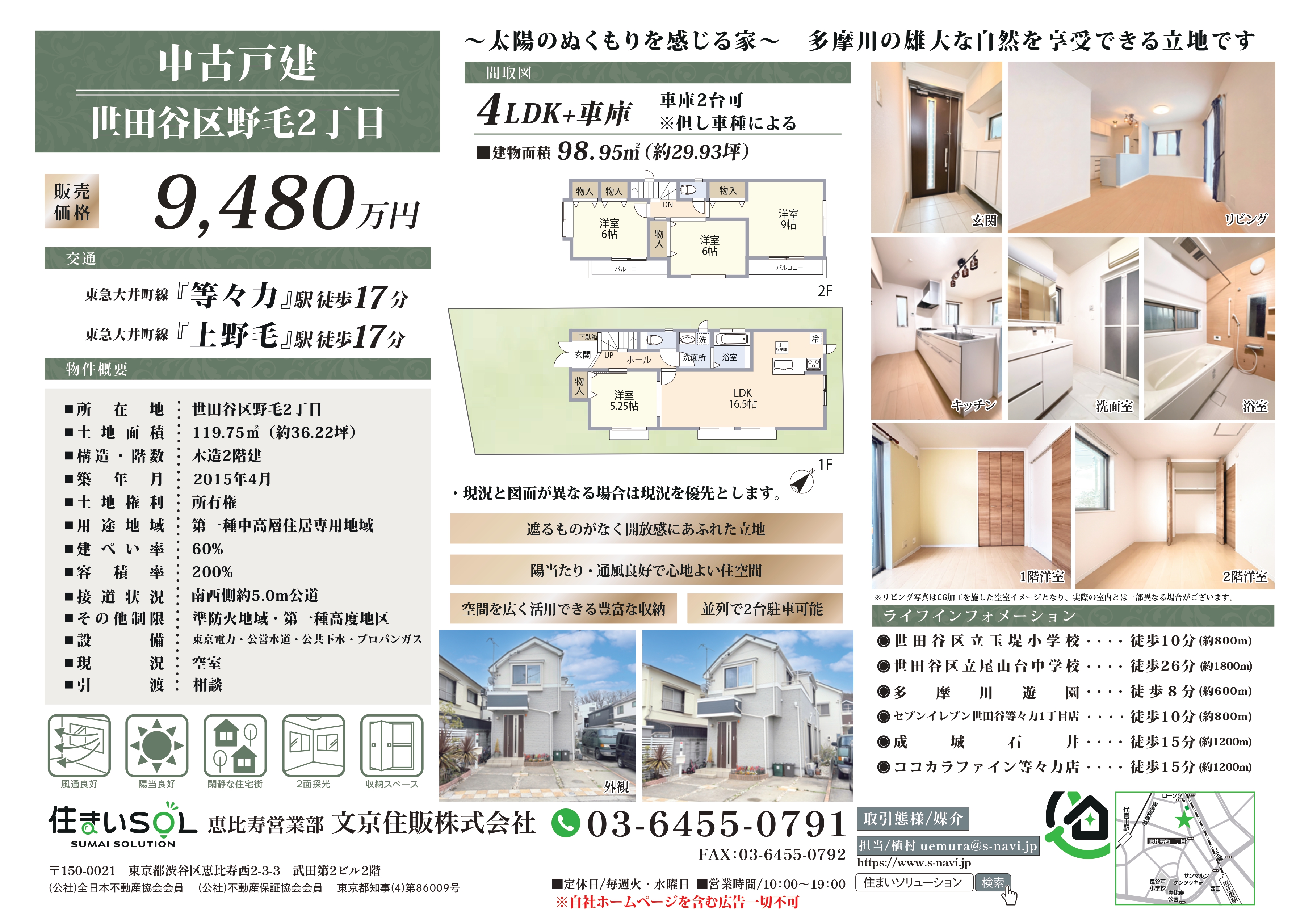 「世田谷区野毛2丁目 中古戸建」は、2015年築の木造2階建・4LDK+並列2台駐車可能なゆとりある住まいです。交通量の少ない南西側5mの前面道路に面し、穏やかな住宅街の一角に位置。小さなお子様がいるご家庭にも安心しておすすめできる環境です。